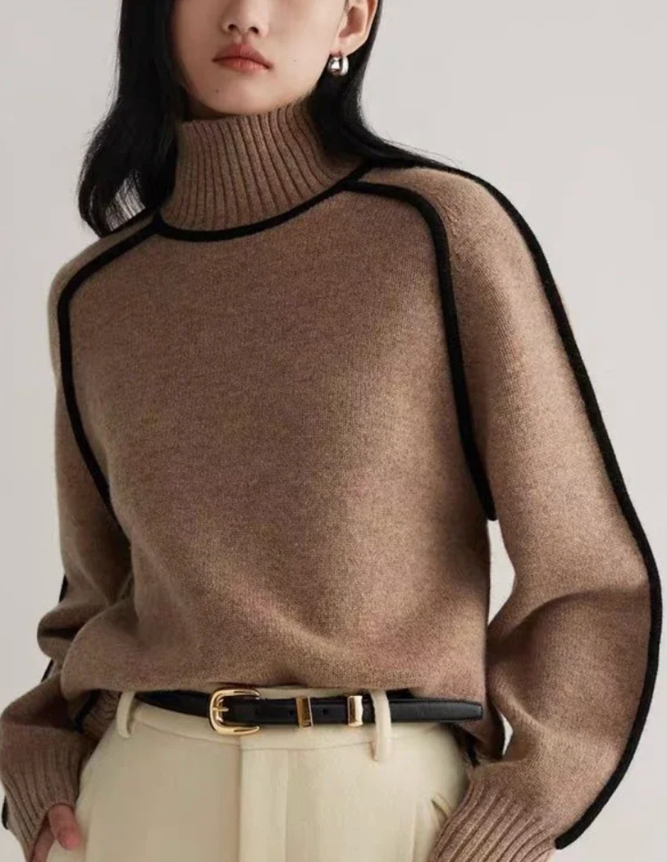 This elegant sweater combines minimalist luxury with modern details. Crafted from a soft wool blend, it offers ultimate comfort and warmth. The subtle contrasting piping along the shoulders and sleeves gives the classic cut a refined, contemporary feel. Perfect with trousers or jeans for a chic, effortlessly stylish look.